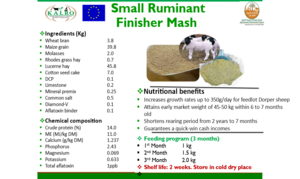 Small ruminant feedlot finisher rations are lacking in the Kenyan markets. The weight target is currently achieved within a longer period of approximately 2-3 years in pastoral livestock production systems. KALRO Mariakani is one of the KALRO Centres who benefited from EU AgriFI CS APP funding to develop, test, validate and commercialize feedlot finishing rations for small ruminants. The new ration innovation is aimed at reducing the rearing period from 3 years to only 7 months to reach market weight. Finished product certification process with KEBS is 60% complete. Various product descriptors are now available for product certification and commercialization.