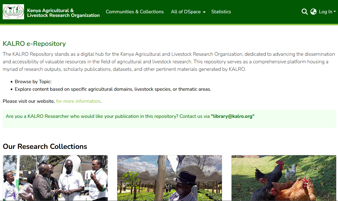 KALRO e-Repository The KALRO Repository stands as a digital hub for the Kenya Agricultural and Livestock Research Organization, dedicated to advancing the dissemination and accessibility of valuable resources in agricultural and livestock research. This repository serves as a comprehensive platform housing a myriad of research outputs, scholarly publications, datasets, and other pertinent materials generated by KALRO. Browse by Topic: Explore content based on specific agricultural domains, livestock species, or thematic areas. Please visit our website, for more information. Are you a KALRO Researcher who would like your publication in this repository? Contact us via "library@kalro.org"
